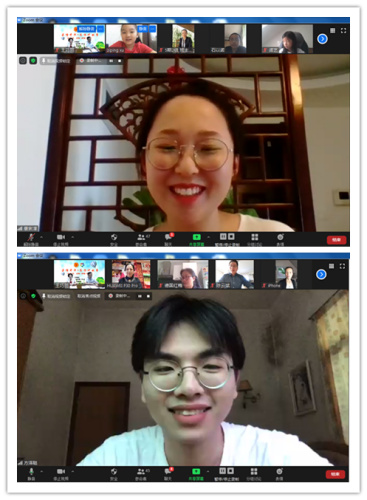营员家长代表枭帆(上)、班主任李青青(下)在线致辞。 班主任李青青表示,网上夏令营是一个很好的交流平台,希望营员们认真用心参与,博大精深的中华文化一定会给孩子们带来新奇的体验。 为了提升办营效果,在总结前几期经验的基础上,本期泉州市侨联专门安排泉州师院对外汉语专业的小老师在微信群中进行语音教学并与营员互动,相信在小老师的指导下,可以进一步加深营员对中华文化的理解,提高学习兴趣。开营仪式结束后,来自泉州师院的小老师在zoom上给营员们上了生动有趣的第一堂课。