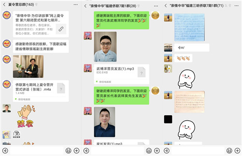 火热开营中 中国侨联文化交流部部长刘奇线上寄语,“我相信参营的每一位营员都能怀着一颗火热的心,带着一份火热的情,积极投入到新一期网上夏令营中来。我们的故事是精彩的,小任务也是很吸引人的。半个月的时间说长不长,说短不短,要珍惜这美好的时间。未曾谋面,但十五天后我们会成为老朋友;相聚云端,十五天的记忆将成为美好的回忆。衷心的希望各位营员能静下心来听故事、开动脑筋来互动,活跃起来多交流,共同感受故事里的寓意和故事外的精彩。” 福建省侨联副主席张瑶在开营式上致辞,向参加本期夏令营的营员、家长、老师、组团单位们表示衷心的感谢和热烈的欢迎!对海外华裔青少年们在学习中华文化和疫情防控知识方面取得的丰硕成果表示赞赏。她表示,海外华裔青少年热切的学习需求是激励继续办好网上夏令营的动力源泉,将一如始终的办好接下来的两期网上夏令营活动,并希望新老营员们能够努力学习,展示更多优秀学习成果,与亲友、同学分享,与身边的小伙伴一起了解中国,爱上中华文化。 各组团单位代表分别在开营仪式上致辞,表示这次网上夏令营的活动,得到了海外侨胞的共同赞赏,感谢中国侨联、福建省侨联的精心组织,勉励营员们认真学习,并祝愿他们有一个丰富有趣的暑期生活。