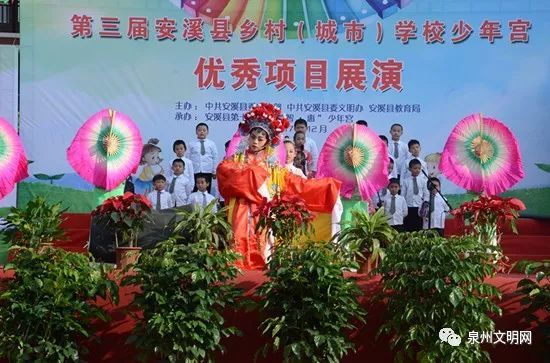 同时,安溪每年组织举办乡村学校少年宫成果展示展演活动,为各学校交流学习和广大农村未成年人“人人出彩”提供平台、创造机会。展演包括现场彩绘、茶艺、手抄报、书画、竹藤编等个人项目和集体才艺展演以及反映各学校少年宫建设成果的图片、作品展示活动。活动还评出一批优秀项目和优秀辅导员。