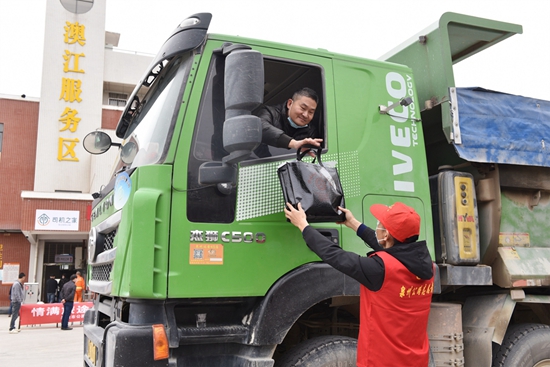志愿者向在澳江公路服务区“司机之家”向货车司机送上暖心大礼包。张卉 摄