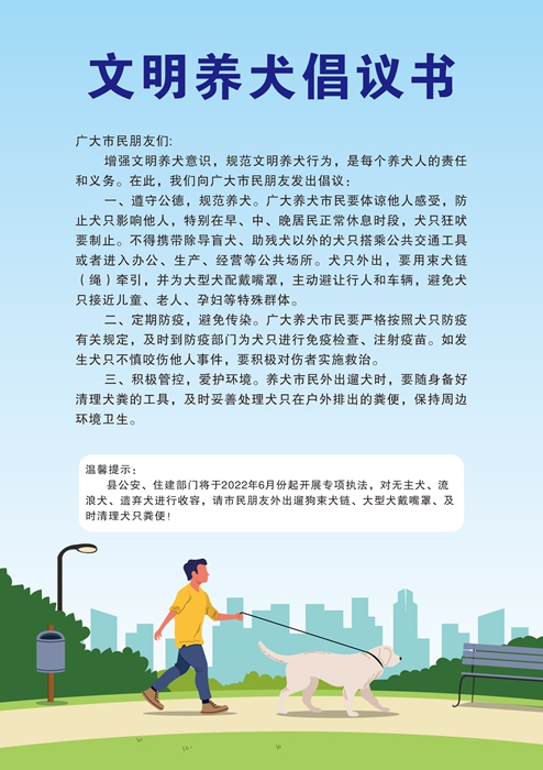 文明风5月26日讯 随着生活质量的提高,越来越多的家庭开始养犬,文明养犬是文明社会的一种体现,争做文明养犬人,创建人犬和谐的美好家园,则是每位养犬人的责任和义务。