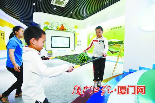 小朋友在做“彩虹行动”小游戏。 厦门日报记者 张江毅 摄