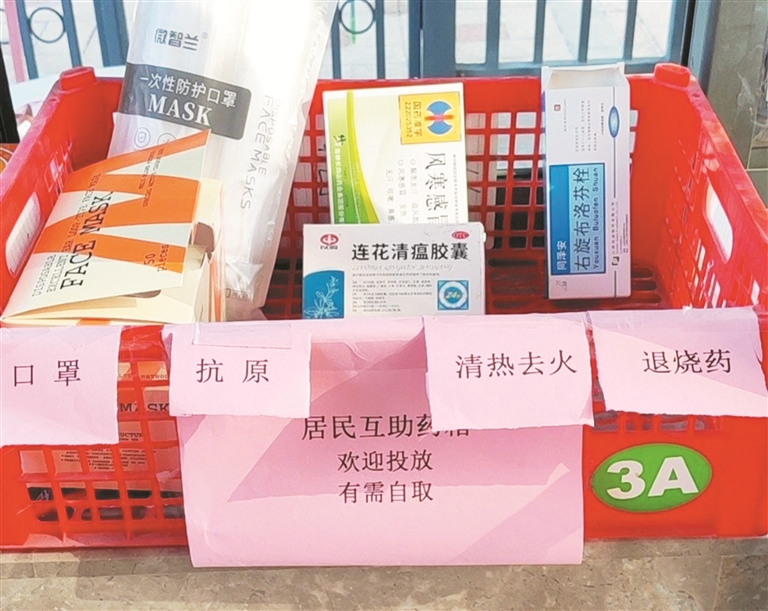 风寒感冒颗粒、医用退热贴、复方鱼腥草合剂、板蓝根颗粒……多种药物摆放在药箱内。前来放置药品的王女士告诉记者,不知道自己带来的药能不能用得上,希望能帮到邻居们。