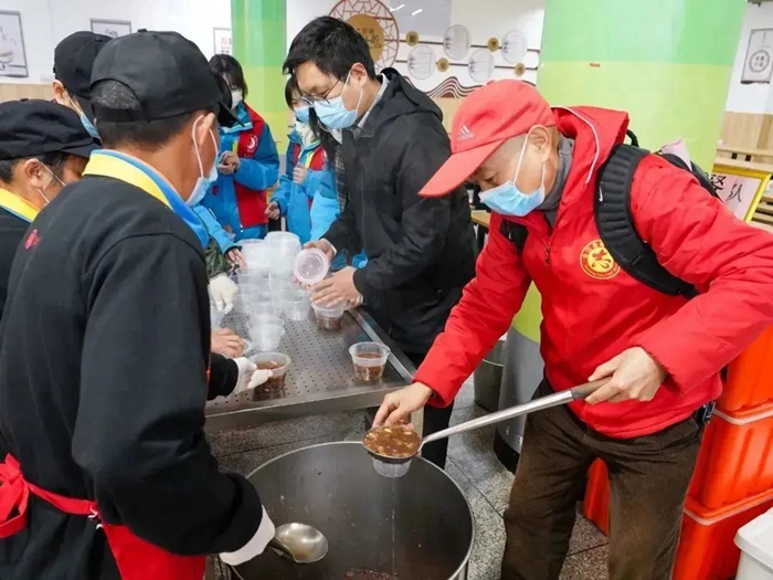 志愿者为老人们准备拗九粥(陈阜 摄)