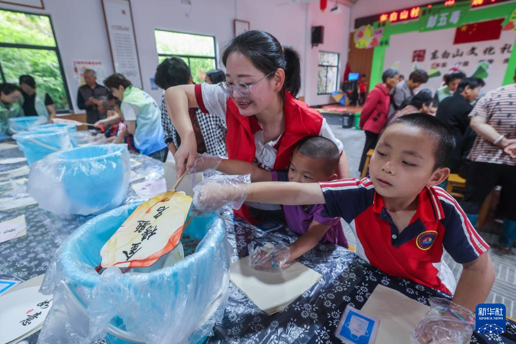 6月5日,孩子们在志愿者的指导下学习漆扇制作。 当日,浙江省诸暨市东白湖镇乐龄中心、社工站携手志愿者在东白山村文化礼堂组织村里的小朋友和老人共同参与了乡村端午民俗活动,让乡村“一老一小”群体感受端午传统民俗的魅力。 近年来,诸暨市东白湖镇依托乡镇公共服务空间,以传统节日为载体,持续开展文化下乡、“共享五福”等惠民服务,丰富乡村百姓的精神文化生活,增强乡土文化的凝聚力与感染力,描绘出一幅幅生动的乡村文化振兴画卷。 新华社记者 徐昱 摄