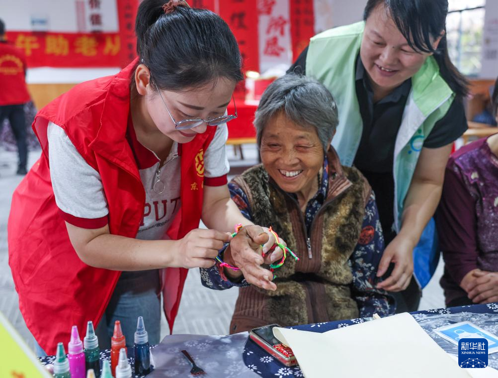 6月5日,志愿者在东白湖镇东白山村文化礼堂给老人戴上端午五彩绳。 当日,浙江省诸暨市东白湖镇乐龄中心、社工站携手志愿者在东白山村文化礼堂组织村里的小朋友和老人共同参与了乡村端午民俗活动,让乡村“一老一小”群体感受端午传统民俗的魅力。 近年来,诸暨市东白湖镇依托乡镇公共服务空间,以传统节日为载体,持续开展文化下乡、“共享五福”等惠民服务,丰富乡村百姓的精神文化生活,增强乡土文化的凝聚力与感染力,描绘出一幅幅生动的乡村文化振兴画卷。 新华社记者 徐昱 摄