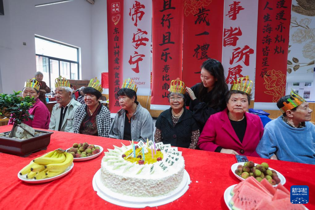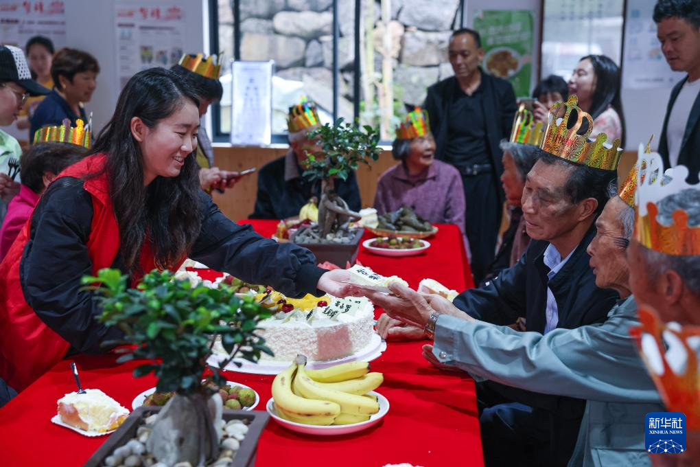 6月5日,老人在东白山村文化礼堂内参加集体生日宴,志愿者为老人送上生日蛋糕。 当日,浙江省诸暨市东白湖镇乐龄中心、社工站携手志愿者在东白山村文化礼堂组织村里的小朋友和老人共同参与了乡村端午民俗活动,让乡村“一老一小”群体感受端午传统民俗的魅力。 近年来,诸暨市东白湖镇依托乡镇公共服务空间,以传统节日为载体,持续开展文化下乡、“共享五福”等惠民服务,丰富乡村百姓的精神文化生活,增强乡土文化的凝聚力与感染力,描绘出一幅幅生动的乡村文化振兴画卷。 新华社记者 徐昱 摄