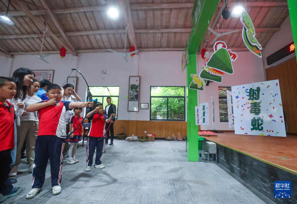 6月5日,孩子们在东白湖镇东白山村文化礼堂参加“射五毒”游戏。 当日,浙江省诸暨市东白湖镇乐龄中心、社工站携手志愿者在东白山村文化礼堂组织村里的小朋友和老人共同参与了乡村端午民俗活动,让乡村“一老一小”群体感受端午传统民俗的魅力。 近年来,诸暨市东白湖镇依托乡镇公共服务空间,以传统节日为载体,持续开展文化下乡、“共享五福”等惠民服务,丰富乡村百姓的精神文化生活,增强乡土文化的凝聚力与感染力,描绘出一幅幅生动的乡村文化振兴画卷。 新华社记者 徐昱 摄 |