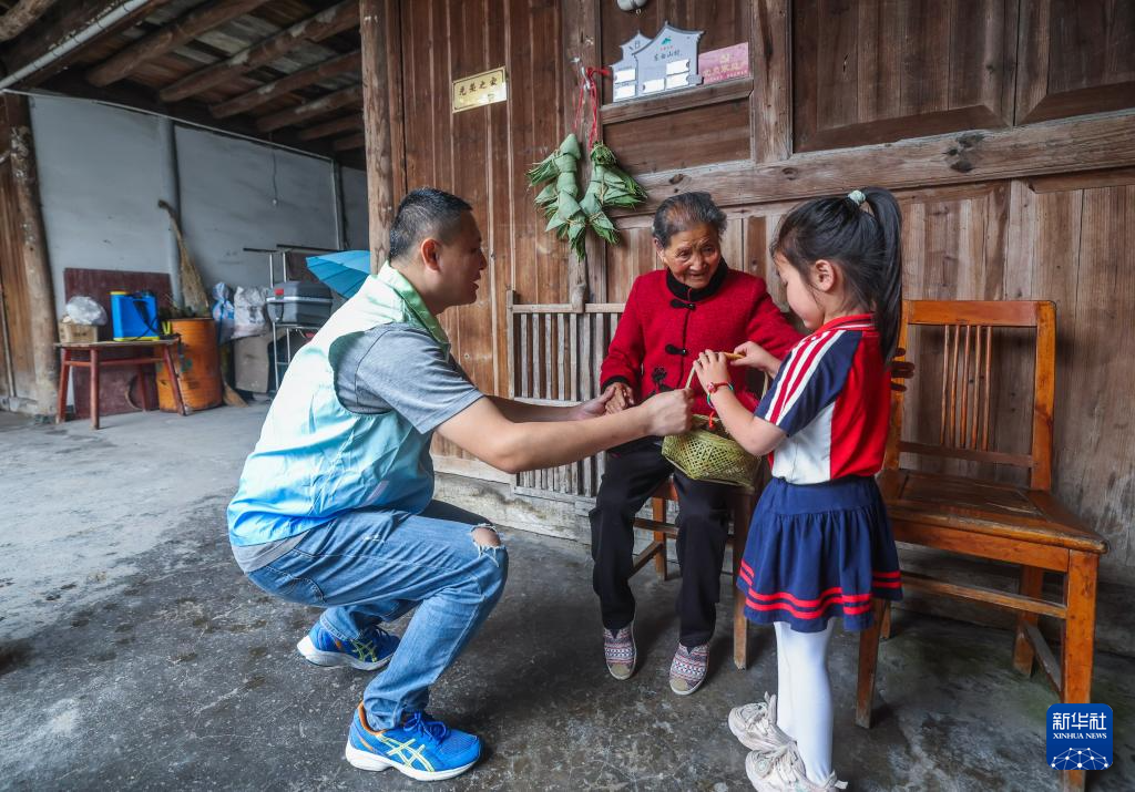 6月5日,志愿者上门给东白山村行动不便的老人送上端午节礼。 当日,浙江省诸暨市东白湖镇乐龄中心、社工站携手志愿者在东白山村文化礼堂组织村里的小朋友和老人共同参与了乡村端午民俗活动,让乡村“一老一小”群体感受端午传统民俗的魅力。 近年来,诸暨市东白湖镇依托乡镇公共服务空间,以传统节日为载体,持续开展文化下乡、“共享五福”等惠民服务,丰富乡村百姓的精神文化生活,增强乡土文化的凝聚力与感染力,描绘出一幅幅生动的乡村文化振兴画卷。 新华社记者 徐昱 摄