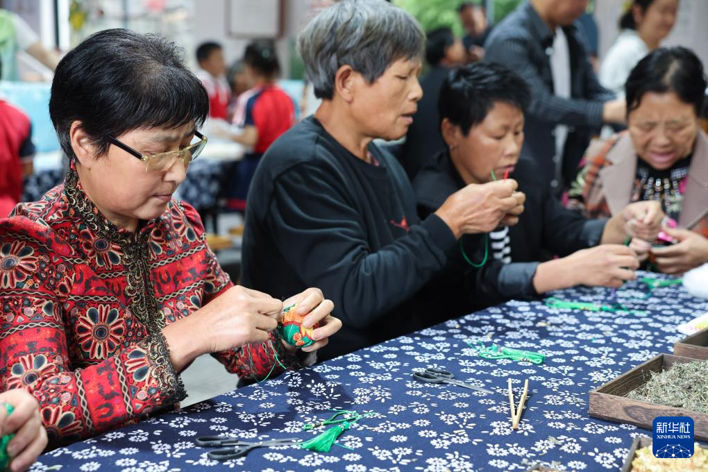 6月5日,老人在东白湖镇东白山村文化礼堂体验制作端午香囊。 当日,浙江省诸暨市东白湖镇乐龄中心、社工站携手志愿者在东白山村文化礼堂组织村里的小朋友和老人共同参与了乡村端午民俗活动,让乡村“一老一小”群体感受端午传统民俗的魅力。 近年来,诸暨市东白湖镇依托乡镇公共服务空间,以传统节日为载体,持续开展文化下乡、“共享五福”等惠民服务,丰富乡村百姓的精神文化生活,增强乡土文化的凝聚力与感染力,描绘出一幅幅生动的乡村文化振兴画卷。 新华社记者 徐昱 摄