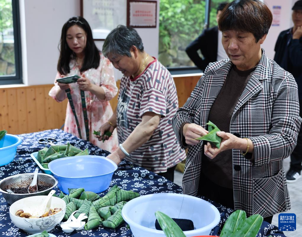 6月5日,老人在东白湖镇东白山村文化礼堂包粽子。 当日,浙江省诸暨市东白湖镇乐龄中心、社工站携手志愿者在东白山村文化礼堂组织村里的小朋友和老人共同参与了乡村端午民俗活动,让乡村“一老一小”群体感受端午传统民俗的魅力。 近年来,诸暨市东白湖镇依托乡镇公共服务空间,以传统节日为载体,持续开展文化下乡、“共享五福”等惠民服务,丰富乡村百姓的精神文化生活,增强乡土文化的凝聚力与感染力,描绘出一幅幅生动的乡村文化振兴画卷。 新华社记者 徐昱 摄