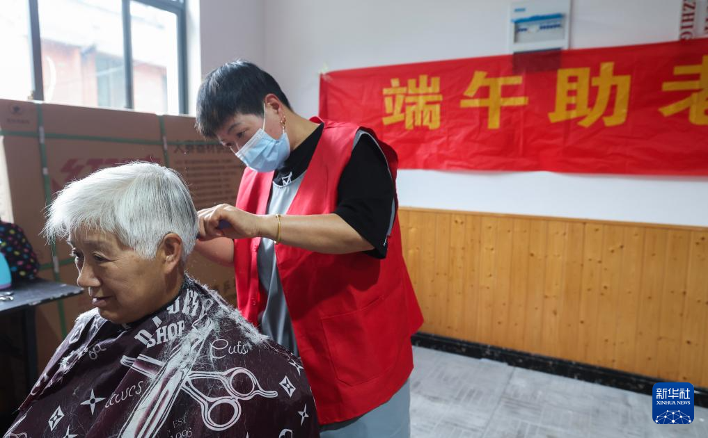 6月5日,志愿者在东白湖镇东白山村文化礼堂给老人义务理发。 当日,浙江省诸暨市东白湖镇乐龄中心、社工站携手志愿者在东白山村文化礼堂组织村里的小朋友和老人共同参与了乡村端午民俗活动,让乡村“一老一小”群体感受端午传统民俗的魅力。 近年来,诸暨市东白湖镇依托乡镇公共服务空间,以传统节日为载体,持续开展文化下乡、“共享五福”等惠民服务,丰富乡村百姓的精神文化生活,增强乡土文化的凝聚力与感染力,描绘出一幅幅生动的乡村文化振兴画卷。 新华社记者 徐昱 摄