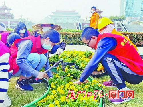 志愿者义务种植草花。 厦门日报讯(文/图 记者 林桂桢)昨日,一场以“共建青山绿水 同庆建党百年”为主题的义务植树活动在集美新城市民广场举行。来自集美区市政园林局、集美城发园林有限公司的近70名党员志愿者用双手种植草花,以良好的城市面貌迎接党的百年华诞。 本次活动突出庆祝建党百年主题,发挥园林人的专业特长,在一块约700平方米的土地上种下4万株草花,拼成一幅特别的图案——用火红的一串红、金黄的孔雀草拼出一面中国共产党党旗,用三色堇拼出“1921—2021”的字样,以此献上对建党百年的美好祝福。 |