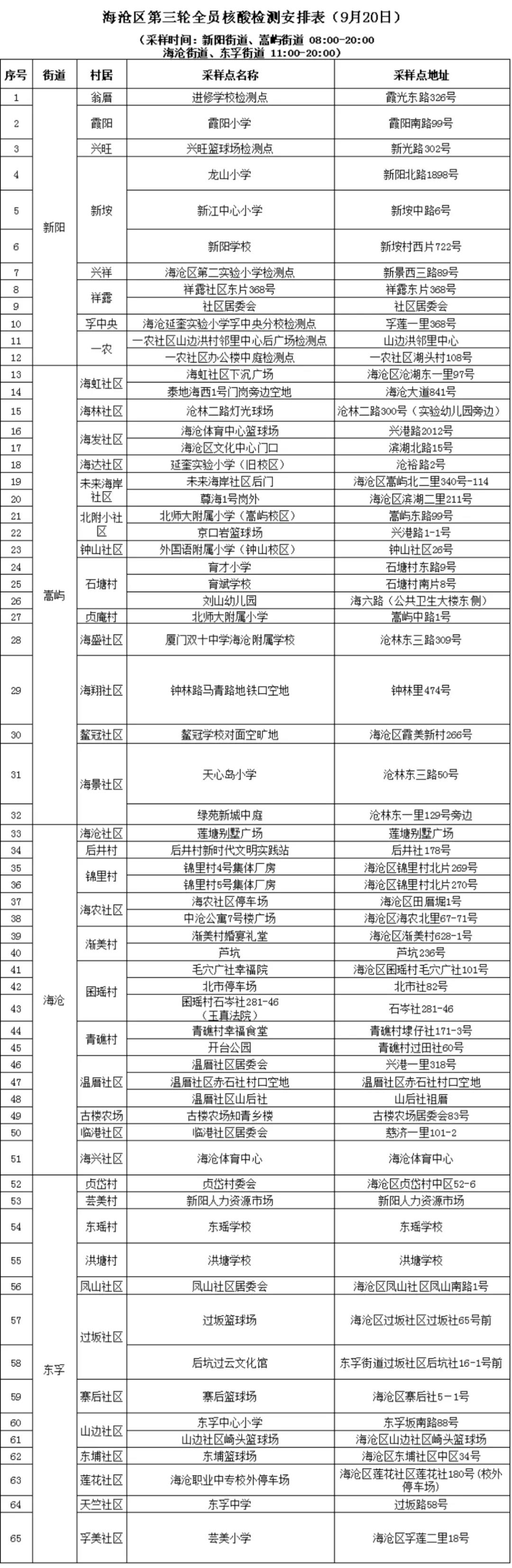 厦门市海沧区应对新冠肺炎疫情工作指挥部〔2021〕第14号通告 根据厦门市疫情防控指挥部统一部署,为及时有效发现和控制传染源,与病毒赛跑、与时间赛跑,坚决阻断疫情扩散蔓延,决定于2021年9月20日(周一)当天开展海沧区第三轮全员新冠病毒核酸检测。有关事项通告如下: 此次核酸检测的区域范围划定为海沧区行政区域全域,在该区域内工作、生活的人群均需开展核酸检测。核酸检测时间安排为: 9月20日08:00—20:00 新阳街道片区、嵩屿街道片区 9月20日11:00—20:00 海沧街道片区、东孚街道片区 请上述人员严格按照片区时间安排,并根据社区(村)、企业通知的时段,携带本人有效身份证件,及时前往采样点进行核酸检测。对于行动不便人员,社区(村)可以组织上门采样,确保全员覆盖、不漏一人。 凡应检未检,造成疫情传播的应承担相应法律责任。 核酸检测期间,请全体人员务必做好个人防护,保持一米线距离,严格规范佩戴口罩,自觉接受体温检测,提前做好预约登记。 附件:海沧区第三轮全员核酸检测安排表 厦门市海沧区应对新冠肺炎疫情工作指挥部 2021年9月20日