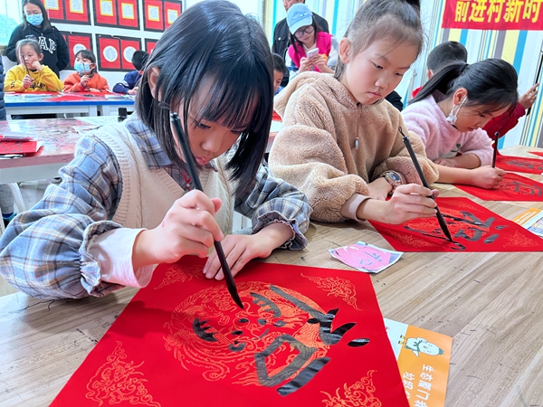 图六:孩子们正在学习用毛笔书写“福”字。(前进村新时代文明实践站 供图)