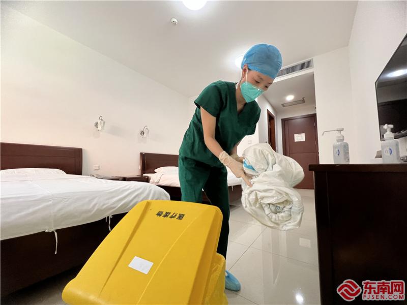 参赛医务人员小心翼翼地将脱下的防护服放进垃圾桶。东南网记者 李霖 摄