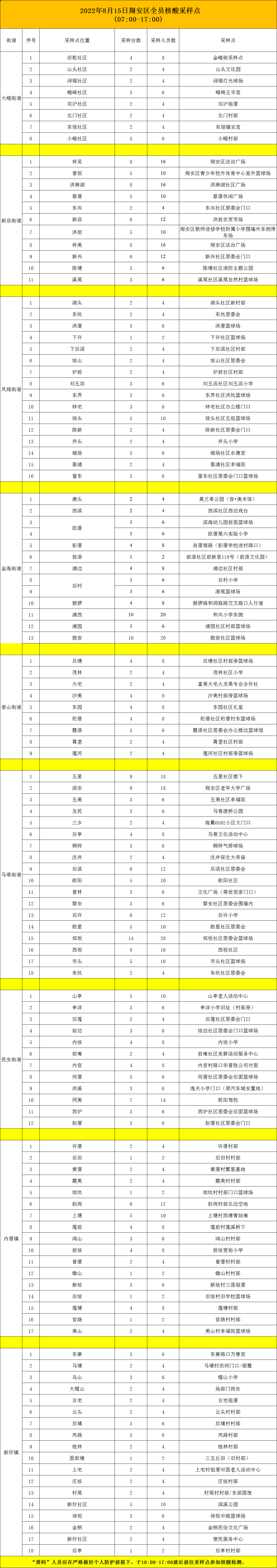 东南网8月14日讯(本网记者 夏菁)14日,厦门市翔安区应对新型冠状病毒感染肺炎疫情工作指挥部发布第6号通告,根据厦门市应对新冠肺炎疫情工作指挥部〔2022〕第21号通告精神,翔安区决定于8月15日开展一轮全员核酸检测。 一、采样时间 2022年8月15日(星期一)7:00—17:00。 二、采样对象 在翔安区的所有人员(含生活、工作、旅行的常住人口、流动人口、台港澳及外籍人员等)。 三、采样地点(详见下表) 四、注意事项 1.请区域内的群众按照社区通知的时间段,携带本人有效身份证件,佩戴好口罩,前往上述采样点进行核酸检测。扫码预登记,可有效缩短排队等候时间。请提前关注“业翔民安”公众号或听从社区安排扫描二维码,为本人及家人进行预登记。 2.请广大群众听从街道、社区统一安排,有序排队,保持“一米线”距离,不扎堆、不聚集。 3.在接种新冠病毒疫苗48小时内暂不进行核酸采样,待48小时后再进行采样,但需及时向社区工作人员报备说明情况。 4.新冠病毒感染者出院后3个月内不参加核酸混管采样,可于次日(8月16日)到便民核酸点说明情况并单人单管采样。 5.各用人单位和社区要加强督促检查。拒不配合核酸检测的,将依法依规追究责任,做到应检尽检、不漏一人。