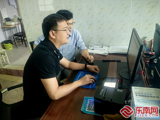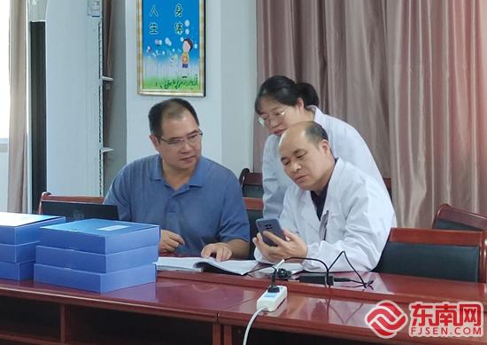 灌口镇中心卫生院副院长黄海瑞(左)在清流县了解当地“优质服务基层行”创建工作具体情况。(集美区卫生健康局供图)
