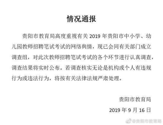 微博截图 人民网北京9月17日电 16日,有网友称贵阳市2019年统一公开招聘中小学、幼儿园教师笔试考试泄题,引发社会关注。 针对此事,贵州省贵阳市教育局通报称,已会同有关部门成立调查组,对考试各个环节进行认真调查,调查结果将实时公布。若调查核实机构或个人有违规或违法行为,都将按有关法律法规严肃处理。