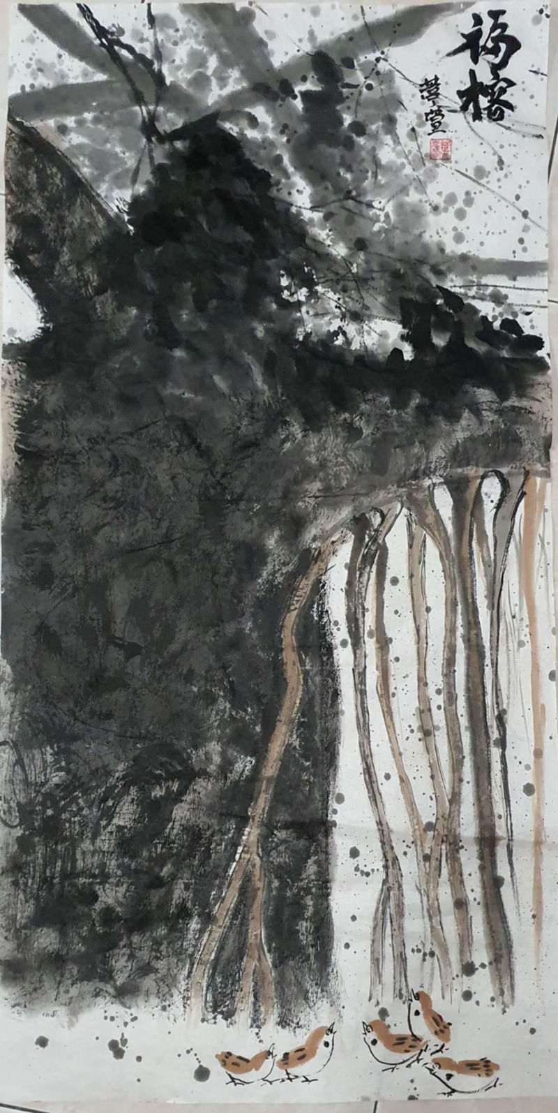 创作思路:福州又称榕城,因此榕树算是福州的其中一个象征。榕树能在很狭小的空间里生长成一棵参天大树,像极了福州人不惧艰难、坚定不拔的精神。榕树上垂下来的一条条气根,也就像海外千千万万的华侨。即使离开了家乡在别处扎了根,主根却还是在我们原来生长的地方,根相连,心相系。