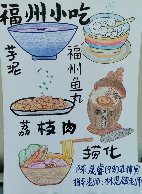 创作思路:经过“亲情中华网上听你讲故事”,关于福州有一定的了解,美食是一座城市的表现,也是一座城市的生活方式,所以我从网上了解到了福州的典型美食,了解他们的制作方法,也从图片中感受到福州美食的美好。我想把这一份美食的美好分享给更多的人。