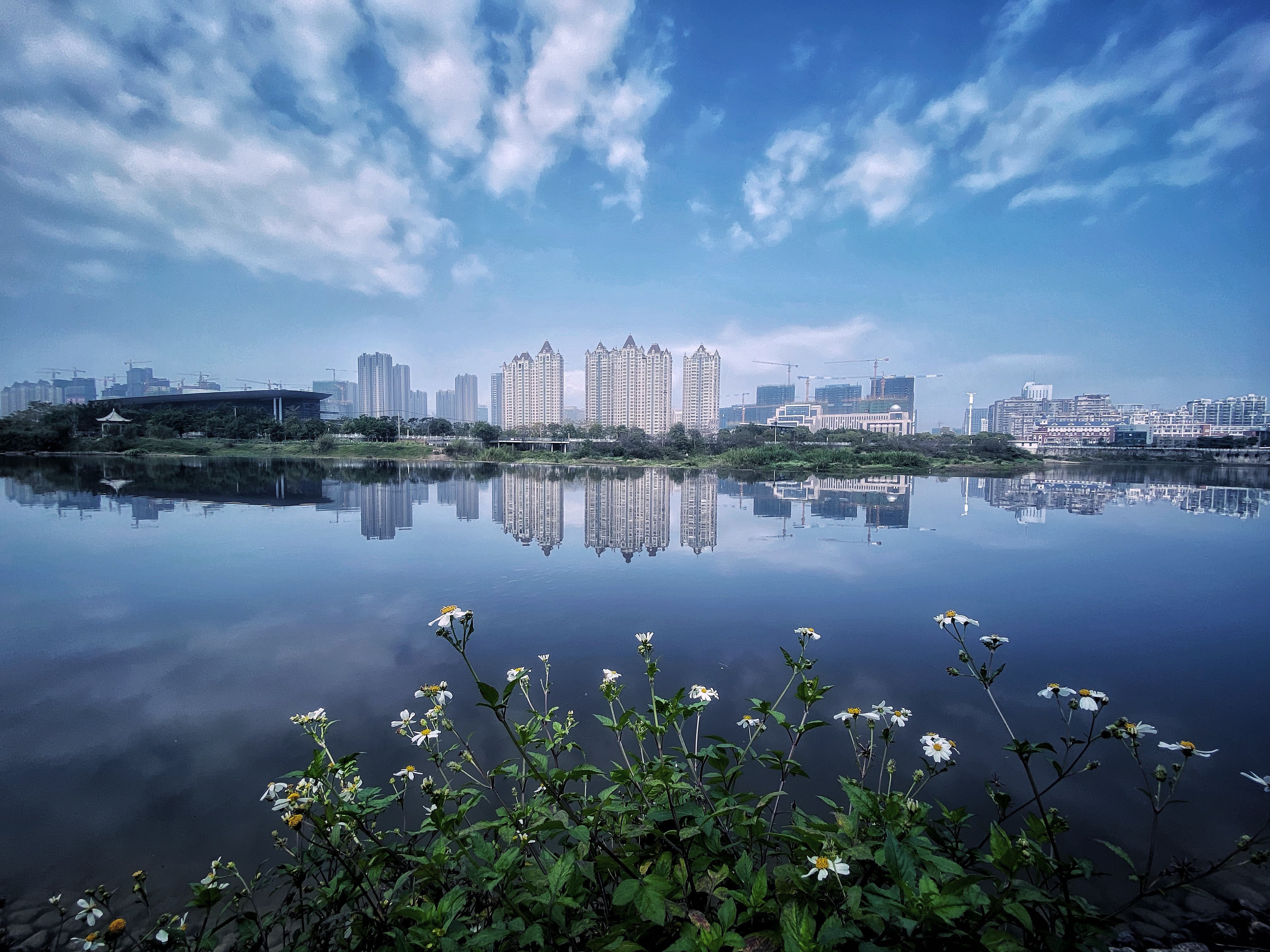 小作者难得可贵懂得用前景的白色小花衬蓝调时分的天空和湖水,用慢门将天空的云拍出流动的效果。