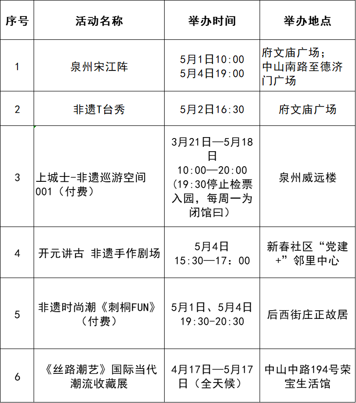非遗展演精彩不停 非遗芳华闪耀古城 节日期间,各类非遗展演将在古城大街小巷轮番上演,让市民游客在欢声笑语中领略泉州深厚的文化底蕴。其中,泉州宋江阵结合《水浒传》中108将人物形象,演绎青狮阵、宋江阵传统民间特色艺阵、武术以及高甲戏打斗杂耍等,重现泉州“棍棒手扑,妙绝天下”的民俗风采;非遗T台秀将非遗元素与现代时尚设计巧妙融合,展现非遗独特魅力。