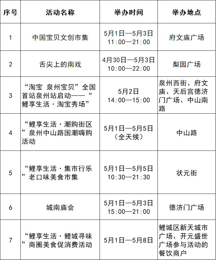 各类市集火热开市 乐购一触即发 中国宝贝文创市集借助淘宝平台,吸引全国20家手工艺人创新创作,聚焦泉州戏曲、非遗等文化元素,打造联名款创意市集,开展非遗产品展示和教学互动。舌尖上的南戏将结合全国南戏展演开展泉州美食体验。“鲤享生活·淘宝秀场”由淘宝吉祥物淘小宝带领8个IP人偶,沿泉州影剧院广场—中山中路—打锡街—府文庙西南门等路线巡游,沿途直播推介鸿星尔克、安踏、匹克、名创优品等国潮品牌。 “鲤享生活·集市行乐”老口味美食市集一站式打卡“舌尖上的泉州”,活动期间还有公益义诊、闽南武术表演、掌中木偶路演、戏曲路演、现代乐队演出、特色美食、划拳比赛等。城南庙会打造“匠心传承·劳动筑梦”主题庙会双节联动的文化盛宴,通过“非遗活化展演+情景交互体验+美食文创市集消费”三位一体模式,聚商气促消费。