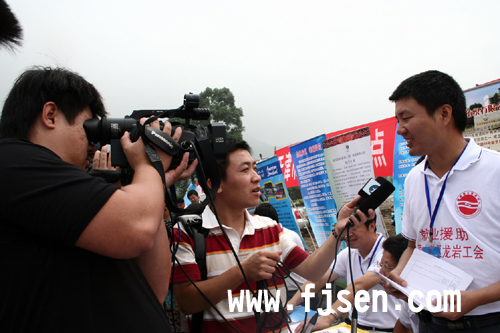 福建在彭州举办就业招聘会,图为省广播影视集团记者尹丁(左)、陈兴中(中)在采访现场。为加强对口支援宣传力度,提升宣传实效,我省在彭州设立了记者站,来自福建日报和广播影视集团的5位记者及各地市驻前通讯员,不辞辛劳,深入采访,点滴记录了我省援建工作进程,反映了海西儿女无私支援灾区的感人情怀。