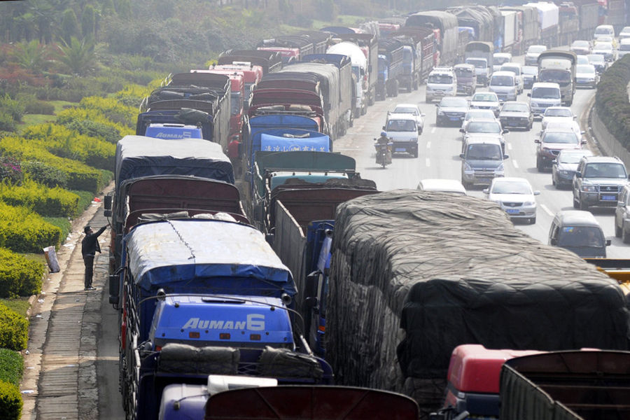 11月14日,大货车在进入昆明方向的中国石化石虎关加油站,待加油的车辆排长队。从河北来的驾驶员说,“从昨晚就在这里排队了,到现在快中午了,还没排到”。当问起驾驶员一路走来其他地方是否也有这种现象时,驾驶员回答“高速公路上的加油站也排着长队”。