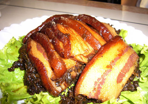 梅菜扣肉 用三层肉或少量瘦肉,和永定菜干用钵子装在一起放进锅里蒸到肉烂、气味浓香为宜。这是有名的永定梅菜扣肉,肉酥菜嫩,鲜香醇厚,好下饭、下酒。 |