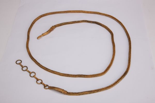 名称:鎏金腰带 年代:南宋(公元1127-1279年) 尺寸:通长170厘米。 来源:2007年“南海一号”沉船打捞出水 收藏:广东省博物馆 简介:该腰带全长1.7米。由四股八条鎏金线编织而成,器身截面呈方形,中间隆起,饰璎珞纹,后有方孔连接腰带。带的另一端有四个小孔用以调节松紧。 |