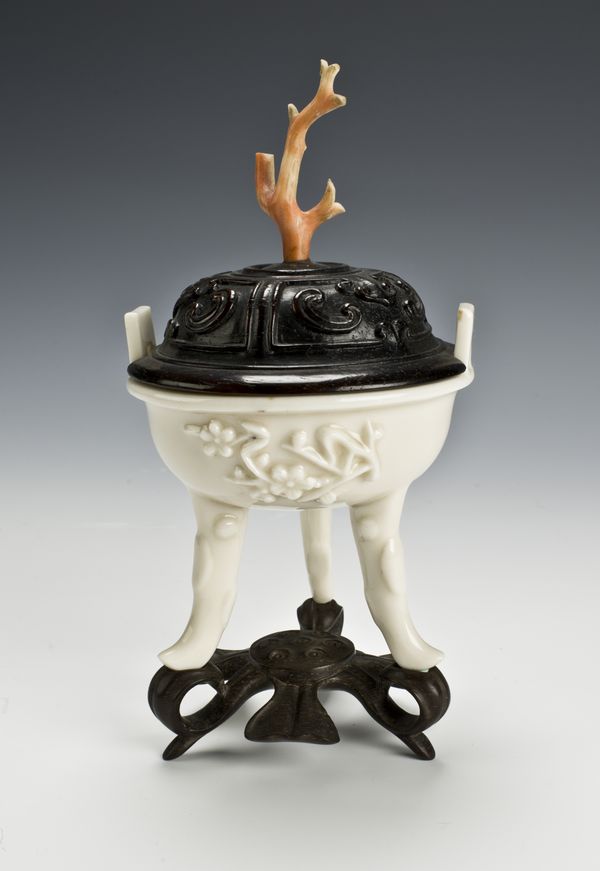 名称:德化窑堆贴梅花双耳三足炉 年代:明(公元1368~1644年) 尺寸:口径8.4、高9厘米。 收藏:福建博物院 简介:敞口、平沿外折,上立扁方形双耳,弧腹,圜底,下接三象足。外壁对称各贴一折枝梅花,通体施象牙白釉,外底露肉红色白胎。 |