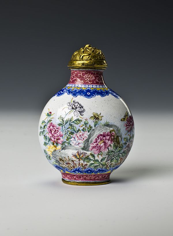 名称:铜胎画珐琅鼻烟壶 年代:清 尺寸:高6.3、腹径4厘米 收藏:山东省博物馆 简介:通体绘牡丹及嬉戏于花间的蝴蝶。造型落落大方,画工精细,色彩艳丽。底有蓝色“乾隆年制”四字楷书款。 |