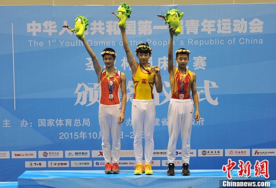 图为女子颁奖仪式。吕明 摄 10月21日,中国首届青运会男子、女子网上蹦床决赛在福建师范大学体育中心举行。最终,来自江苏南通的刘佳霖获男子网上蹦床冠军,浙江宁波的潘宏逸、山西太原的郭家轮位列二、三位;广州队的刘慧获得女子网上蹦床冠军,福州的林倩麒、浙江宁波的陈凌云位列二、三位。 |