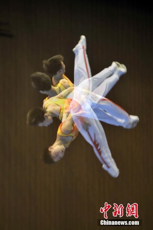 10月21日,中国首届青运会男子网上蹦床决赛在福建师范大学体育中心举行,记者用多重曝光模式拍摄选手在空中的旋转动作。吕明 摄 |