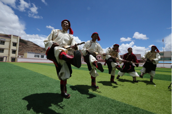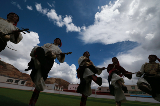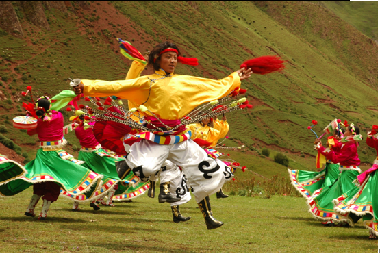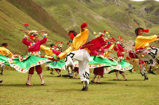 排列也有次序,有舞头有舞尾,排头,即“谐本”一般都是在弦子舞中有影响的人,即能舞又能歌,并且能作词作曲、编舞的人。每首歌舞都有其乐曲、词和跳法,跳一天一夜也跳不完弦子舞,因为弦子舞内容太多,也可以借题发挥,它是一个唱不完跳不完的舞蹈。在芒康有这样的一个说法“有结束的不是弦子舞”。 跳弦子舞,舞者随着弦子的晃动而发出的阵阵“颤声”,舞蹈上相应产生一股股“颤法”,多以模拟一些善良、吉祥的动物姿态动作为其形体特征,如:《孔雀吸水》、《兔子欢奔》等等。舞步圆润、舒展、曲调悠扬流畅,弦子舞的“拖步”、“点步转身”、“晃袖”、“叉腰颤步”等动作,尤其是长袖飘飞很有特色。弦子舞舒展中有股矫健奔放,在流畅之中有优美开放,在舞蹈中表现出康巴人骠悍的气质。 弦子舞唱词表达的内容非常广泛,有歌唱劳动生活的;有描绘自然景色的;有倾吐爱情的;有祝酒祝愿的;也有歌颂宗教、高僧活佛、寺庙的;解放以后,歌唱党、歌颂毛主席、歌颂党的政策和赞美社会主义新生活、新气象的也较多。由于内容的不同,弦子舞有豪情壮语的歌舞;有情语绵绵、海誓山盟的爱情歌舞;有欢乐的劳动生活和追求美好生活的歌舞等等。弦子舞不仅给人于音乐上的享受,而且它是一个民间语言的精华,奔放驰骋的民间自由诗,测试智力的民间游戏,给人于向上的精神食粮,富有浓郁的生活气息和深刻的教育意义。 丁青热巴:藏族文化艺术历史悠久,源远流长,这里是歌舞的海洋,昌都在漫长的历史长河中形成了自己所独有的艺术文化,丁青县更可以说是热巴舞的起源之地。并且在2002年被西藏自治区人民政府命名为“热巴艺术之乡”。“热巴”这种据记载起源于公元十一世纪,由藏传佛教噶举派第二代祖师米拉热巴创建,是流传在昌都一带的一种以铃鼓舞为主的说、唱、谐、杂技、戏剧、气功定综合性为一体的表演艺术。传说,丁青县在远古时候属于热带气候,现丁青县城、沙贡乡、色扎乡、尺牍镇均被湖泊淹没,万灵危在旦夕。年轻的米拉热巴为解救黎民百姓,杀大象取其皮铺设于地,并在上面跳热巴舞祭神,热巴舞由此诞生。热巴舞对藏东来讲,犹如阳光和空气一样重要,它伴随着这里的人们日日夜夜,世世代代,在征服“世界屋脊”的漫长岁月里,以强大的精神力量支撑着他们的脊梁。请勤劳、勇敢、智慧、质朴的藏东儿女繁衍生息在这块神奇的土地上,创造了辉煌的物质文明和精神文明。热巴舞这种厚重粗犷、奔放、豪迈且富有原始宗教色彩的舞蹈就产生于康巴人不断地同自然都争的文化底蕴下。热巴舞粗犷、奔放、豪迈,这不仅反映了昌都人民不断同自然斗争中,表现出的不屈不挠、勇于创造的精神。也表现出了这种舞蹈对于支撑藏东儿女的精神动力的强大的文化性。