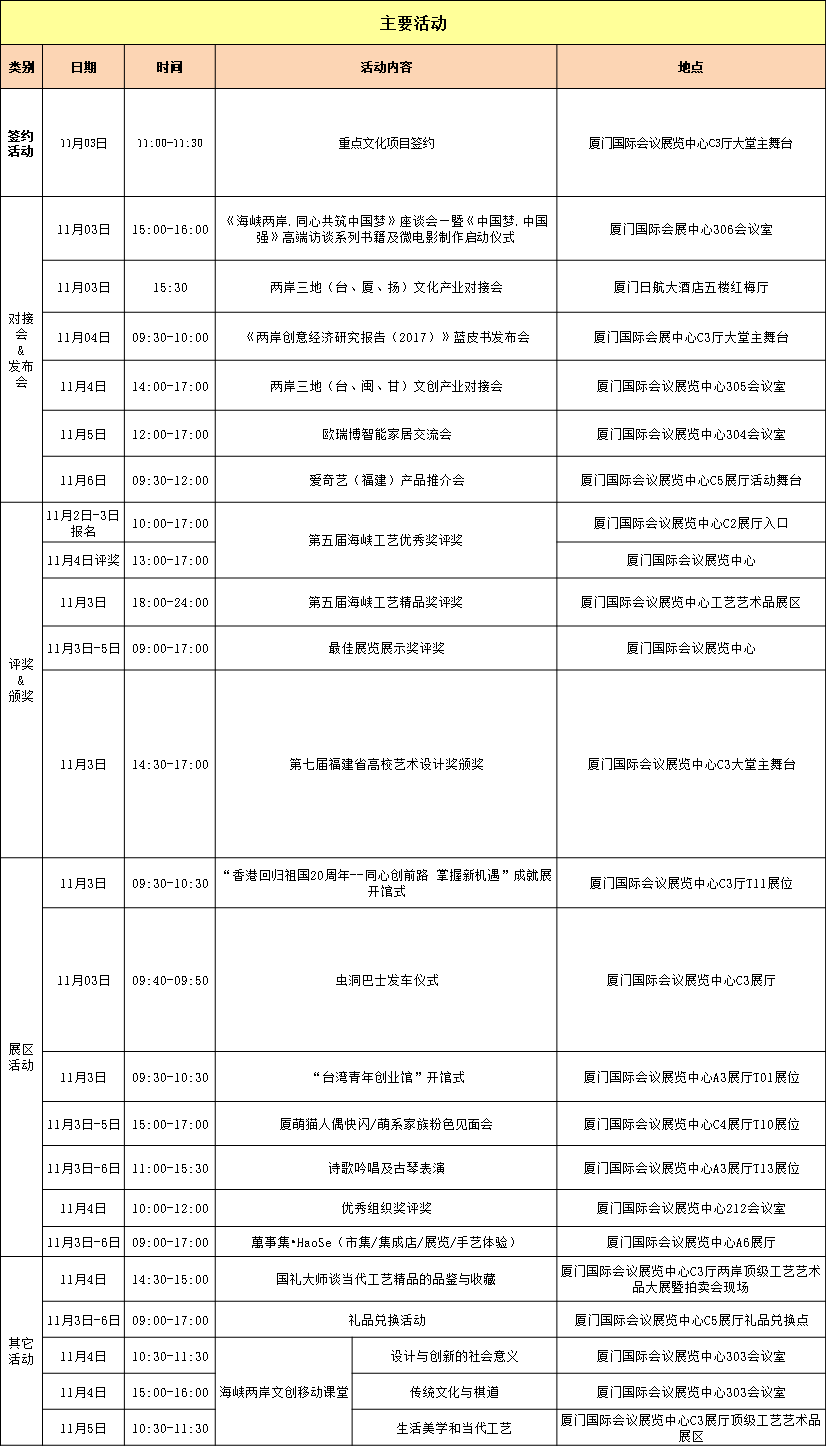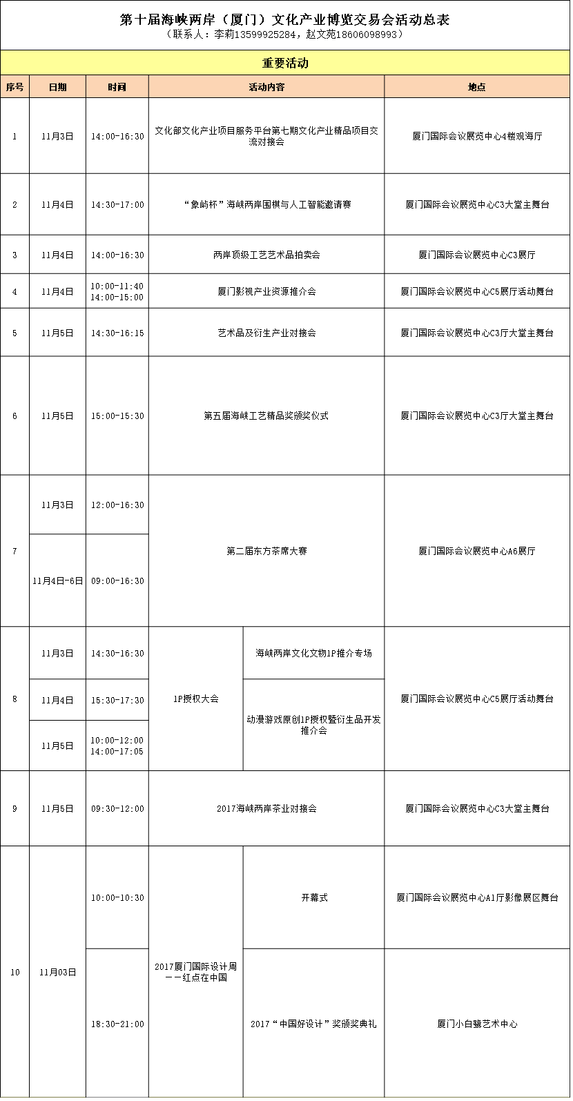 厦门网讯 2017年第十届海峡两岸(厦门)文化产业博览交易会将于11月3日-6日举行。本届文博会本着“务实办展、提升实效”原则,结合时下产业热点呈现诸多创新举措和全新亮点:首次承接文化部文化产业精品项目交流对接会,提升产业与资本对接层次和实效;首设两岸顶级工艺艺术品展区、举办两岸顶级工艺艺术品拍卖会,提升展会品质和交易活力;首设人工智能展区、举办两岸围棋和人工智能邀请赛,以前瞻思维引导对未来文化科技融合前景的思考;力邀全球工业设计“奥斯卡”德国红点设计大奖作品加盟文博会,以全球顶级设计激发两岸业者创意。