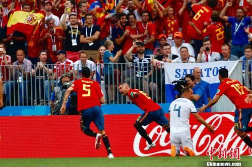 与西班牙的1/8决赛,俄罗斯后卫伊格纳舍维奇打进一记乌龙球。中新社记者 富田 摄
