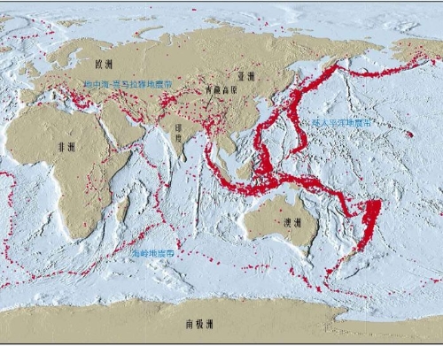 图5 地中海--喜马拉雅地震带的位置。红色圆点代表一个个地震的位置,许许多多红色圆点叠置显示了地震带的存在。图中同时显示了另外两大地震带的局部。 研究发现,印度板块向北推挤,青藏高原地块持续隆升,造成次一级的巴颜喀喇活动地块向东挤出。地块的挤出运动导致断裂活动,这是巴颜喀喇地块边界带上大地震频繁发生的原因。玉树地震之前,在该地块的四个边界分别发生了1997年玛尼7.9级、2001年昆仑山8.1级、2008年于田7.3级和2008年汶川8.0级地震(图6)。 玉树地震发生在巴颜喀喇地块的南边界,该边界主要由甘孜-玉树和鲜水河两大活动断裂带构成。鲜水河断裂带是我国著名的地震活动带之一,它的所有段落历史上均发生过7级以上大地震。甘孜-玉树断裂带位于鲜水河断裂带西侧,二者首尾相接。甘孜-玉树断裂带也是一条活动性很强的断层,有文字记录以来,该断裂带的其他段落都发生过大地震,只有玉树断裂没有记录到强震发生(图6)。2010年玉树7.1级地震填补了该断裂带上的这一空段。从这方面来说,地震在玉树发生并不意外。