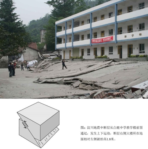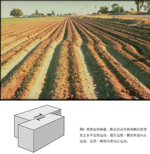 图1 1995年日本阪神7.3级地震,由野岛断层活动产生。地震后当地专门建立博物馆将断层遗迹加以保护。 我们通常说的地震,是由构造活动产生的。我们生活的地球,表面看似平静,实则“暗流涌动”,从其46亿年前开始形成以来,就没有停止过活动。由于地球不断运动和变化,地下岩石受到挤压、拉伸等力的作用,逐渐积累应变能量,当其积累到一定程度超过岩石的强度时,在某些脆弱部位突然破裂和错动,巨大的能量在瞬间急剧释放出来,以地震波的形式由该处向四周传播出去,引起地球表面的震动,这就形成了地震。岩石发生破裂和错动的脆弱部位就是断层(也叫断裂),它是两侧的岩层发生相对移动的一种破裂(图1)。地震是断层活动的一种表现。 断层的活动有两种基本表现方式,上下运动和水平运动。当断层受到垂直方向的挤压或者拉伸时,断层两侧作上下运动,这种断层叫倾滑断层(垂移断层)(图2a)。当断层受到与其平行的剪切力作用时,其两侧物质沿断层走向作方向相反的水平运动,这种断层叫走滑断层(平移断层)(图2b)。当然,自然界的断层运动并不是简单到只有这样的两种运动方式,往往是在地壳中的不同方向地应力的混合作用下产生的复合运动,而这种运动方式往往会影响因断裂活动所释放的地震能量的大小。地球表层发育了许多断层,有的断层形成于较老的地质时期,现在已不再活动,这种断层一般不会发生大地震。发生大地震的断层都是活断层,是距今10万年以来活动过,未来也可能活动的断层,地震主要发生在这种活断层上。