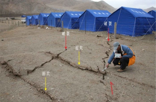 图2 断层活动的基本方式及实例:a,上下运动方式。b,水平运动方式,图片来自KarlMueller。 2.地震,在玉树草原切了一道伤口 在普通大众的眼里,地震一般是山崩地裂、房倒屋塌。确实,地震时会发生“地裂”。这是因为,地震是断层活动引起的,断层运动时会将断裂两侧的地层错开,在地表产生破裂。这就像大地被划了一道口子。地震产生的地表破裂带,包含了关于地震断层的许多信息,成为我们认识断层活动的突破口。
