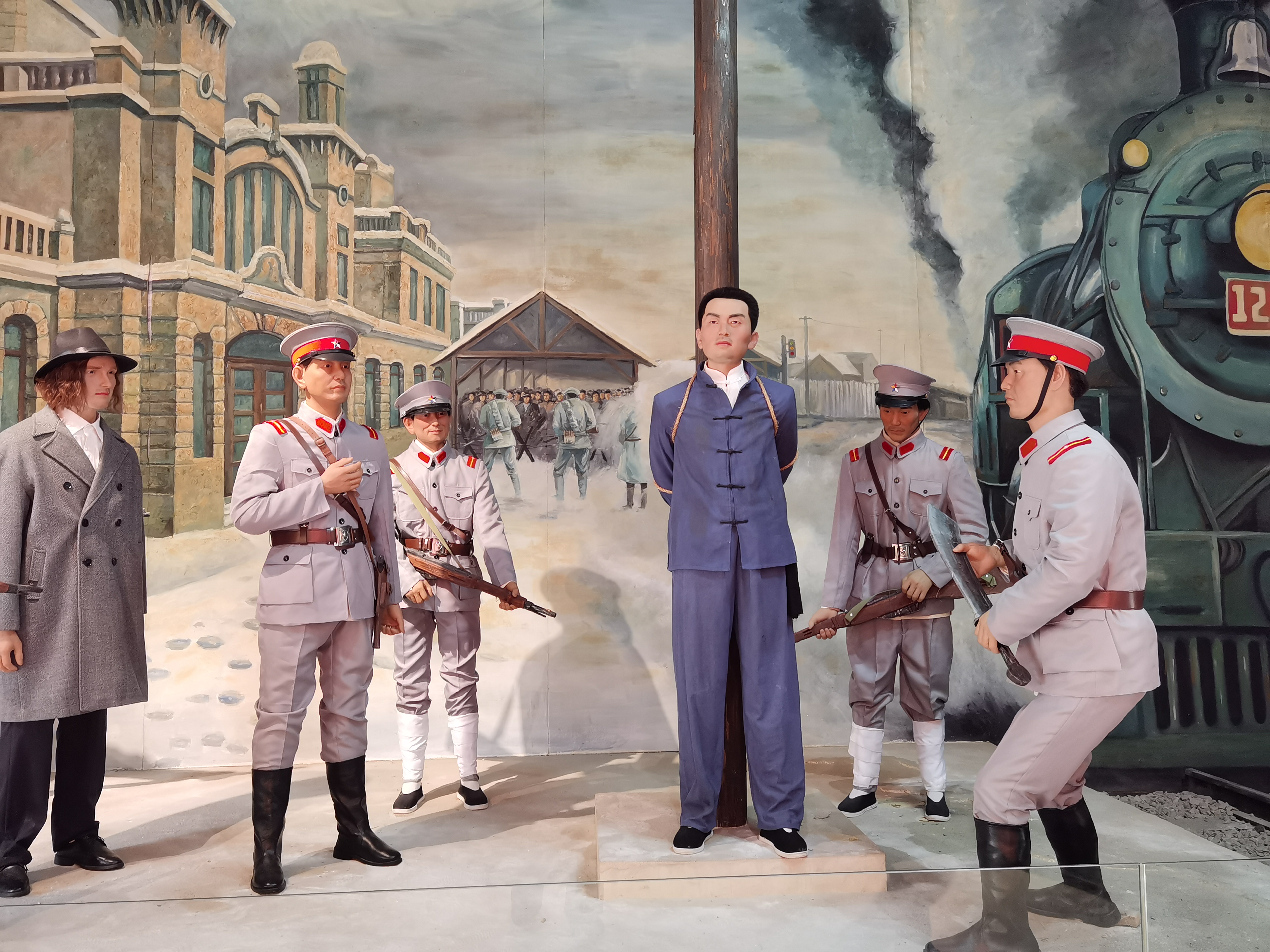 林祥谦被捆绑在车站的电线杆上(东南网记者 吴晓燕 摄) 2月7日,林祥谦带领工人同敌人进行了殊死搏斗,因寡不敌众,被敌人逮捕,捆绑在车站的电线杆上。敌人砍了林祥谦一刀,企图利用酷刑逼他下复工令,林祥谦高喊:“头可断,血可流,工不可复!”在被刽子手砍了7刀后,林祥谦慨然就义,年仅31岁。据悉,林祥谦是有据可考的中国共产党党员中壮烈牺牲的第一位烈士。 重走英雄路,弘扬革命志