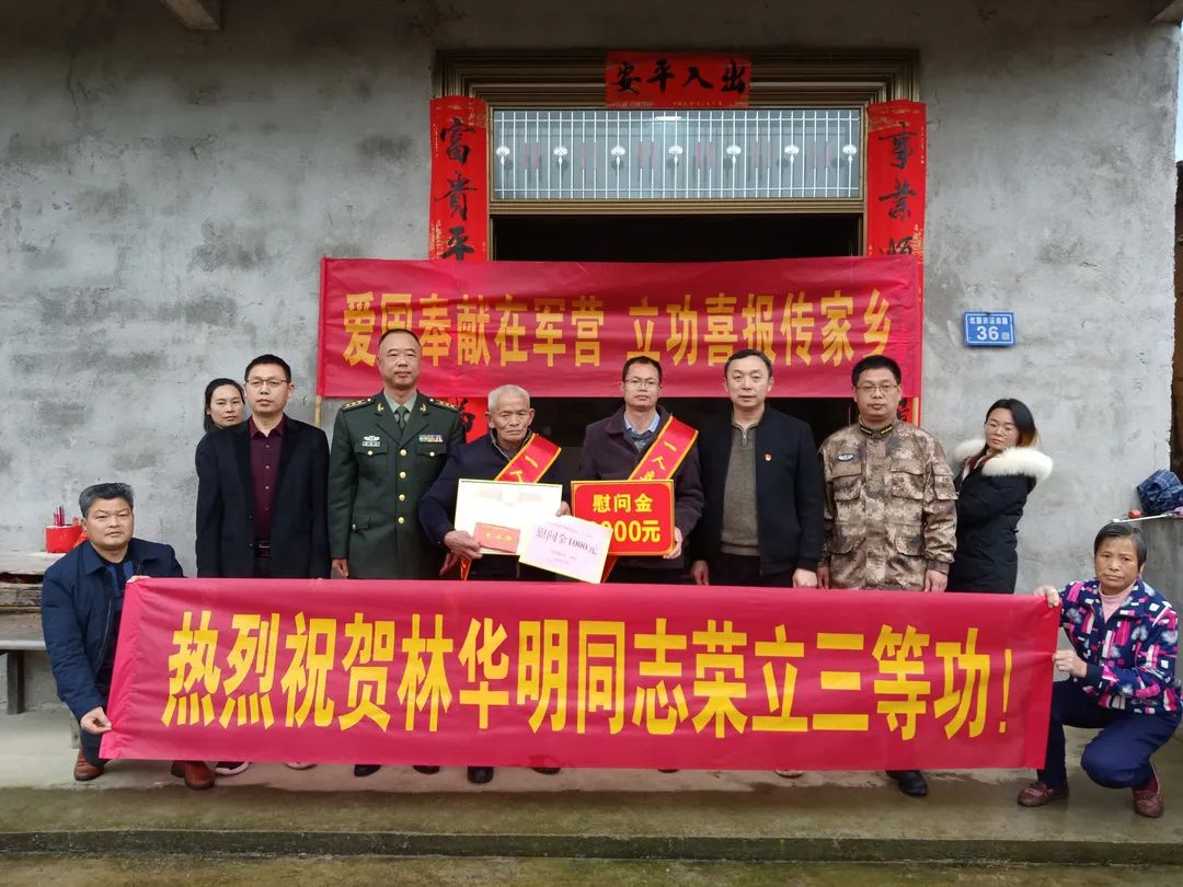 立功送喜报尊崇暖人心近日我省各地又陆续开展了一批为立功受奖军人送喜报活动进一步弘扬拥军优属光荣传统营造尊崇军人的良好社会氛围。 福州市 2月22日上午,福州市闽清县三溪乡前光村村口锣鼓阵阵,闽清县委常委、人武部政委张光增带队来到闽清籍军队文职人员林邦家中,为其家人送上三等功喜报。