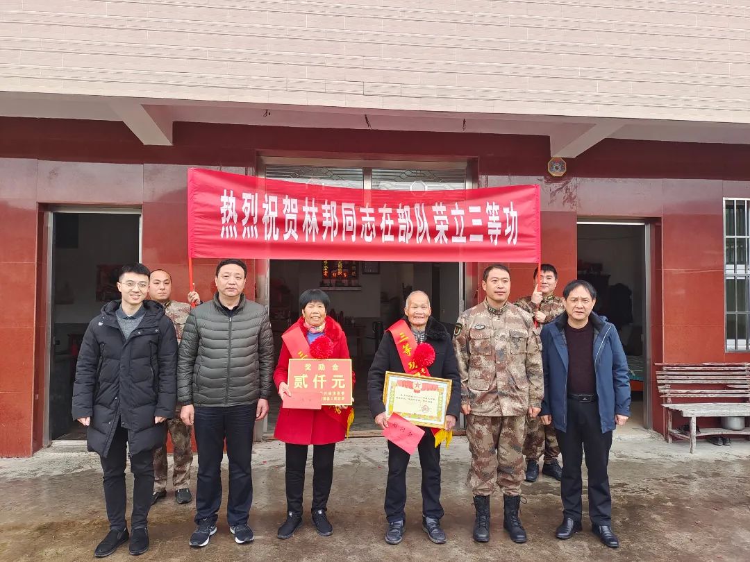 送喜报现场锣鼓喧天,处处洋溢着欢声笑语。军地领导为军属颁发了三等功喜报,为他们披戴绶带,送上慰问金。林邦的爷爷在接过三等功喜报时激动地说道:“衷心感谢党和政府对我们家的关心厚爱,真心感谢部队对林邦的教育培养。我们全家会一如既往地支持他在部队好好干,继续为部队贡献力量,不断为家乡增光添彩。”
