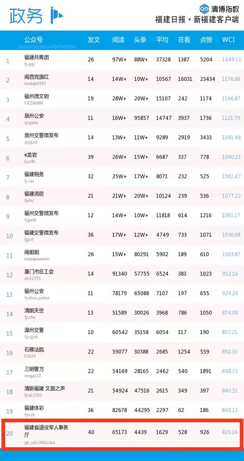 全省排名第十!省退役军人厅微信公众号连续两周入围福建微信影响力排行榜