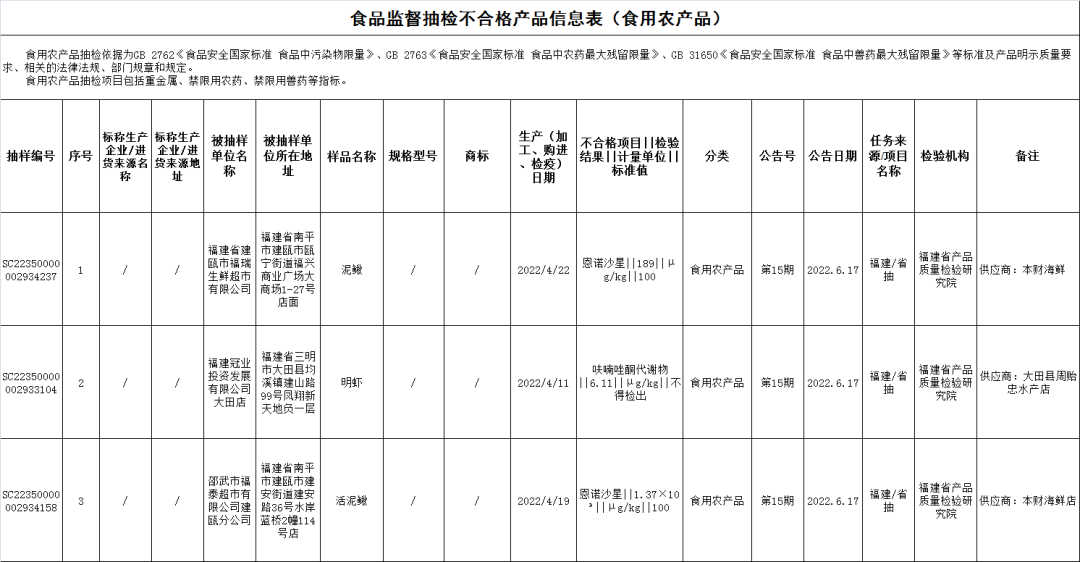 兽药残留问题 福建省建瓯市福瑞生鲜超市有限公司销售的泥鳅(购进日期为2022年4月22日),恩诺沙星不合格,检验机构为福建省产品质量检验研究院; 福建冠业投资发展有限公司大田店销售的明虾(购进日期为2022年4月11日),呋喃唑酮代谢物不合格,检验机构为福建省产品质量检验研究院; 邵武市福泰超市有限公司建瓯分公司销售的活泥鳅(购进日期为2022年4月19日),恩诺沙星不合格,检验机构为福建省产品质量检验研究院。