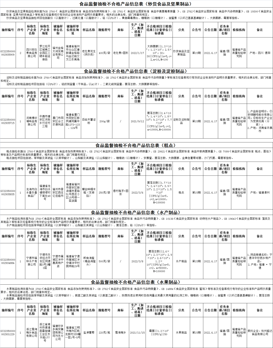 微生物污染问题 四川老灶煮食品有限公司2022年1月17日生产的老灶煮花生(烘炒类),大肠菌群不合格,销售单位为福州金榕大润发商业有限公司,检验机构为福建省产品质量检验研究院; 河南博欣调味品有限公司2021年9月12日生产的百钻木薯淀粉,菌落总数不合格,销售单位为厦门市同安区谷之农便利店,检验机构为福建省产品质量检验研究院; 龙海市白水喜乐喜食品厂2022年3月6日生产的椰丝味糯米糍(芝麻馅),菌落总数不合格,销售单位为福州市晋安区西庄亿佳超市,检验机构为福建省产品质量检验研究院; 宁德市福林水产有限公司2022年3月8日生产的即食海蜇(精品海蜇头),菌落总数不合格,销售单位为宁德市蕉城区洋中惠英特产店,检验机构为福建省产品质量检验研究院; 浙江雪海梅乡食品有限公司2021年11月15日生产的盐津葡萄,霉菌不合格,销售单位为福建好多多商贸集团有限公司列东分公司,检验机构为福建省产品质量检验研究院。