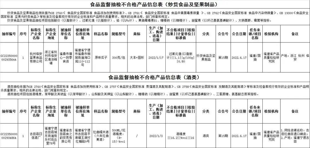 新一期的食品安全抽检 新鲜出炉! 注意! 这些食品抽检不合格 千万别买哦 第15期公告的监督抽检信息涉及27大类食品911批次,包括:粮食加工品、食用油(含油脂及其制品)、调味品、肉制品、乳制品、饮料、方便食品、饼干、罐头、冷冻饮品、速冻食品、薯类和膨化食品、糖果制品、茶叶及相关制品、酒类、蔬菜制品、水果制品、炒货食品及坚果制品、蛋制品、食糖、水产制品、淀粉及淀粉制品、糕点、豆制品、餐饮食品、食品添加剂、食用农产品。合格900批次,不合格11批次。涉及质量指标问题、微生物污染问题、食品添加剂问题、兽药残留问题。 质量指标问题 杭州临安蓝果食品有限公司2022年1月17日生产的原味瓜子,过氧化值(以脂肪计)不合格,销售单位为福鼎市填心一刻零食店,检验机构为福建省产品质量检验研究院; 古田县日信酒厂2022年1月3日生产的红曲糯米酒(六年红曲黄酒),酒精度不合格,销售单位为福建省古田县食之韵贸易有限公司,检验机构为福建省产品质量检验研究院。