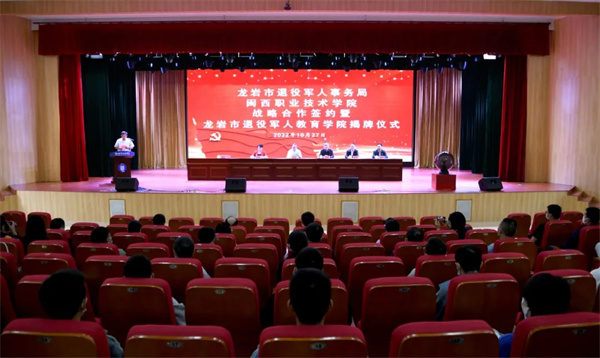 10月27日,闽西职业技术学院大匠堂内灯光闪耀、掌声雷动,龙岩市退役军人事务局和闽西职业技术学院战略合作签约暨龙岩市退役军人教育学院揭牌仪式在这里隆重举行。龙岩市人民政府副市长廖深洪莅临指导,闽西职业技术学院、龙岩市退役军人事务局、四家优待证合作银行领导及学院退役军人大学生代表参加仪式。